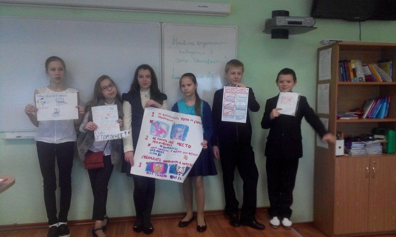 Учащиеся средней школы на уроке посмотрели мультфильмы, подготовленные Лигой безопасного интернета, в которых наглядно представлены опасности, которые могут подстерегать детей в сети, и то, как их избежать. Кроме того, они подготовили и представили плакаты по соответствующей тематике.